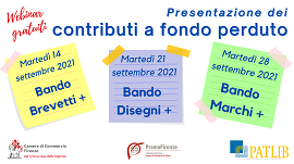 Allo scopo di chiarire i contenuti delle due misure agevolative, Camera di Commercio di Firenze organizza due webinar su piattaforma Zoom nei giorni 21 settembre 2021 (Bando Disegni+) e 28 settembre 2021 (Bando Marchi+) con orario 12.00-13.00.