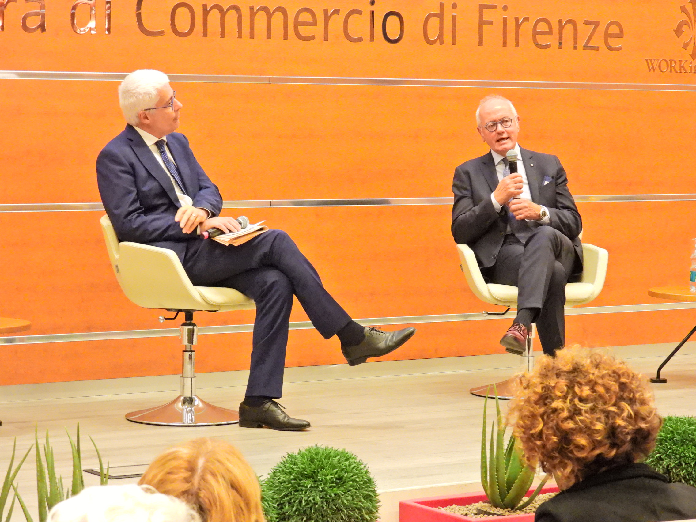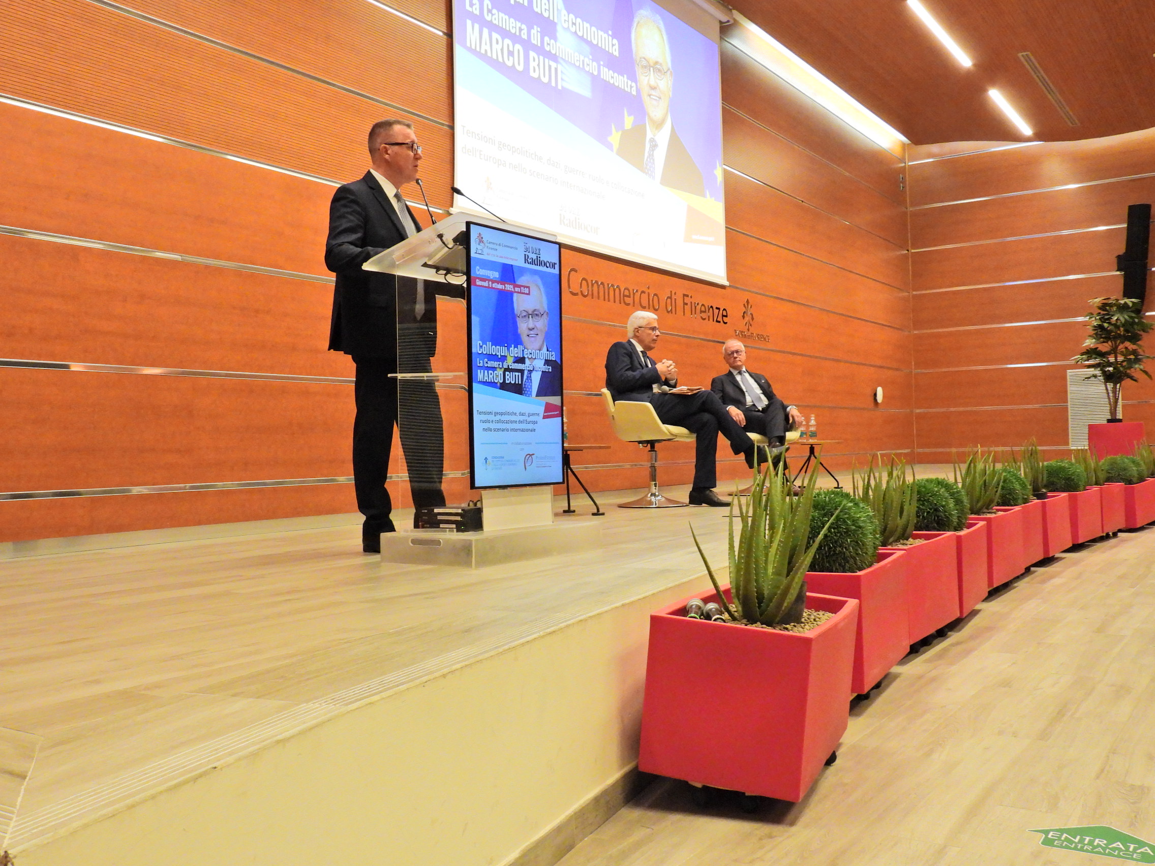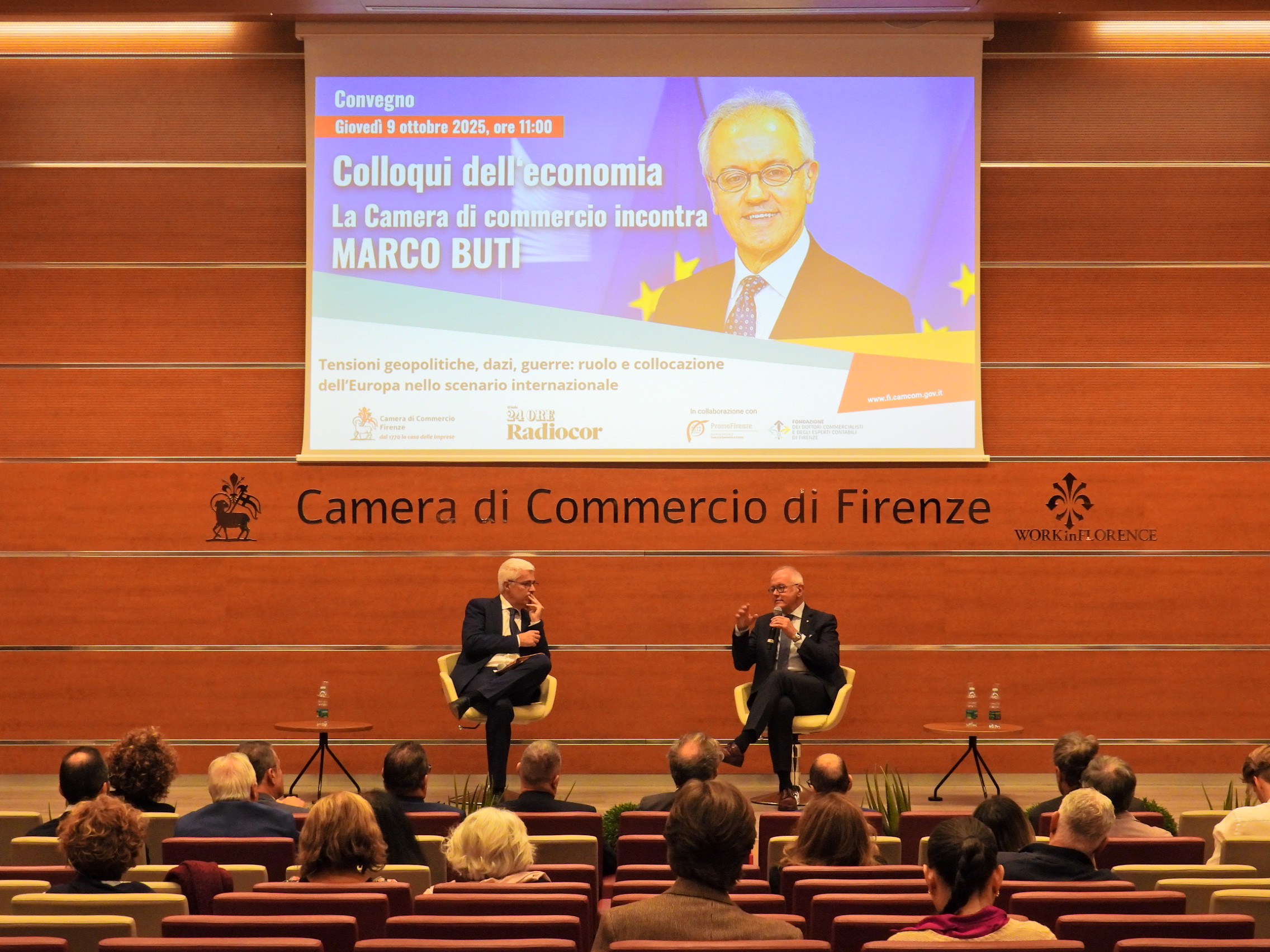 L’intervista a Marco Buti è stata introdotta dai saluti di Massimo Manetti, presidente della Camera di commercio di Firenze. “I Colloqui dell’economia – ha detto il presidente della Camera – sono uno dei momenti più alti di confronto e aggiornamento per la classe imprenditoriale fiorentina a cui offrono una bussola di orientamento sui temi della finanza, della produzione e dei servizi. Nel corso dell’ultimo Colloquio dell’economia, meno di due settimane fa, Lucia Aleotti di Menarini ha sostenuto che l’Europa è frenata dalla burocrazia, promuove analisi che poi però non si traducono in progetti concreti per aiutare le imprese ad essere competitive e profittevoli, non protegge la proprietà intellettuale, avrebbe gli strumenti per reagire all’imposizione dei dazi americani ma se non lo farà i suoi territori continueranno a perdere gli investimenti delle multinazionali che si sposteranno negli Usa. Un pesante atto di accusa, dunque, ideale testimone che passa nelle mani del protagonista del Colloquio dell’economia di oggi Marco Buti”. Manetti ha anche chiuso il Colloquio rinviando ad altri appuntamenti nel prossimo anno: “Ringrazio il professor Buti – ha detto il presidente – mi è piaciuto che abbia sollecitato il confronto tra imprese, parti sociali e istituzioni per individuare e superare quelli che lui ha definito ‘colli di bottiglia’ di ostacolo alla crescita economica”.